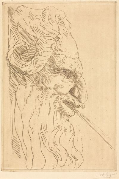 Curator: This etching, attributed to François Chauveau and dating from 1630 to 1650, is entitled "Mask with Long Eyebrows and Mustache and a Headdress with Dangling Cloth, from Divers Masques." Editor: It's…unsettling. The face seems to droop, and the deep etching gives it an almost grotesque quality. I’m drawn to the exaggerated eyebrows and that skeletal grin, though. Curator: As a print, consider the economic aspect. This belonged to a series of "Divers Masques," likely intended for distribution and consumption amongst a specific social group interested in performance. The paper and ink used—were they of high quality or mass-produced? That would tell us a lot about its intended audience. Editor: True. Its purpose would inform its cultural context, and understanding that is essential. Was it a commentary on societal roles or a simple piece of entertainment? The image itself feels quite ambiguous. Those tassels hanging down give me the impression of tears…or maybe stage curtains? Curator: Notice the materiality of the etching lines themselves. The varying thicknesses and depths clearly shape the face. Chauveau employed particular techniques to emphasize volume and texture, thus shaping the viewer's perception. It seems a skillful exploitation of the etching process. The plate had to be prepared so meticulously, which makes one think of all the stages, skill and labour required. Editor: The details, especially the headdress, suggest Baroque sensibilities, albeit tinged with a sort of dark humor. I wonder how these “Divers Masques” were used, were they purely theatrical, or used for private social occasions, or just kept for entertainment in portfolios and print collections? The context and social environment certainly dictates how it should be interpreted. Curator: I think we are able to glean certain socio-economic details through analyzing materials, labor practices and modes of consumption related to its existence. By focusing on these elements we understand how these kinds of imagery served society and catered to the tastes of particular markets. Editor: Absolutely. It allows us to view the artwork less as a single artifact, and more like something integral within its time. A lens through which we see the political and cultural landscape of the 17th century.