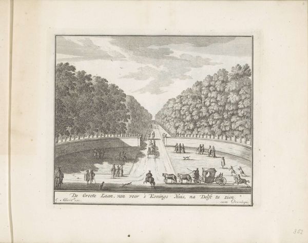Editor: We’re looking at "Weg tussen Honselaarsdijk en Naaldwijk," or "Road between Honselaarsdijk and Naaldwijk," an etching and engraving by Carel Allard, dating from around 1689 to 1702. It's striking how the rigid lines of the road and waterways are set against the softer forms of the trees and sky. How do you approach a piece like this? Curator: I am drawn to the compositional strategy at play. The artist uses a strong perspectival line to pull the viewer's eye deep into the landscape. Note the interplay between light and shadow. Consider how the precision of the lines contribute to the clarity and the receding town offers depth. Editor: Yes, I see that now. It's almost mathematical in its precision. What's the effect of that precision, would you say? Curator: The rigid structure imposed on nature reflects the Dutch emphasis on order and control during the Golden Age. Semiotically, we could read the linear forms as symbols of human intervention and dominance over the natural world, with semi-organic masses providing just enough to connote "landscape". Editor: It’s fascinating how such simple lines can convey so much control. I initially saw it as just a pretty landscape, but now I see the deeper structure. Curator: Exactly. The apparent simplicity belies a complex and deliberate arrangement of forms. Close visual analysis allows us to appreciate not only what is represented, but how it is represented. This method encourages a careful examination of the artistic decisions made in its construction. Editor: Thank you; I find myself noticing things I wouldn’t have seen before. It goes beyond just seeing to truly understanding how art functions visually.