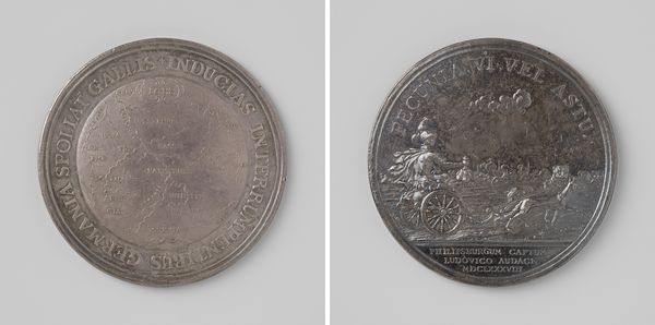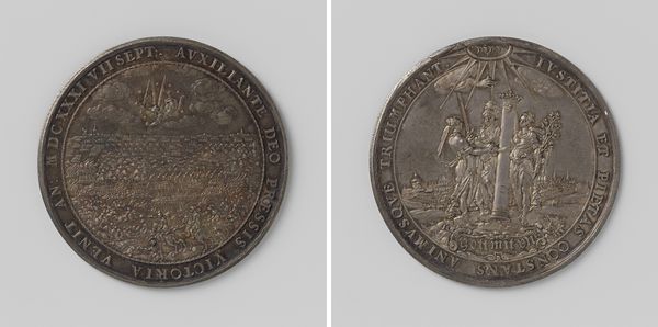This medal, made by Martin Brunner, captures the taking of Rijssel by the Allies. The monochromatic silver flattens the forms and emphasizes the dense textures of the figures, imbuing the scene with a solemnity that transcends mere commemoration. Look at the composition, divided into clear halves. On one side, the allied forces stand regally. Their postures, though static, convey strength. Opposite them, a seated woman, possibly representing Rijssel, gestures in submission. The circular format compresses the scene, creating a sense of immediacy and tension. The medal is more than a historical record. It's a study in power dynamics, rendered through stark lines and contrasting textures. The inscription, acting as a frame, further confines the imagery, turning the medal into a concentrated expression of victory and surrender. Notice how the light reflects off the silver, animating the surface and drawing our eye to the details of this moment frozen in time.