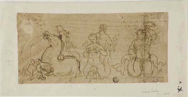 Girolamo Mocetto created this print, Frieze with Tritons and Nymphs, likely in Venice, using etching and engraving techniques on a metal plate. The printmaking process transforms an image into a repeatable matrix, allowing for dissemination on paper, a relatively accessible material. This frieze, teeming with sea creatures and mythical figures, wouldn’t have been possible without highly skilled labor. The density of the lines create shading and texture, which required careful work with burins and acids. The image alludes to classical sculpture, but it is not quite that. This wasn’t a unique work of art like a sculpture or fresco; it was an image intended for a wider audience. In its time, prints like this were often collected in albums, used as inspiration for other art forms, or served as decoration. Understanding this print means thinking about the labor involved in its making, and the social function it served. It collapses the boundaries between high art and practical application.
