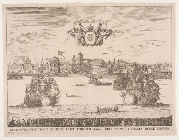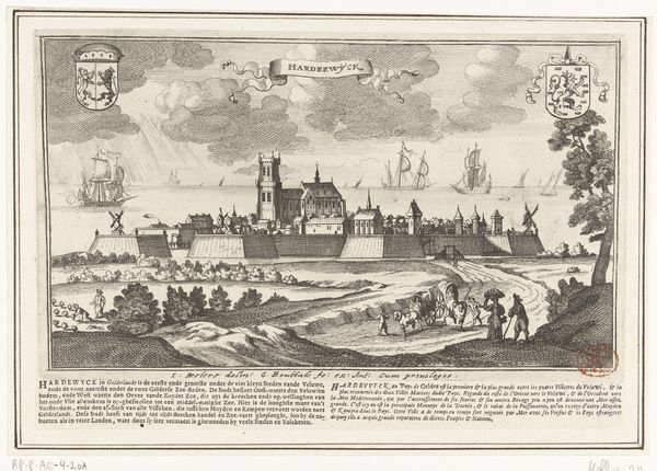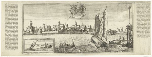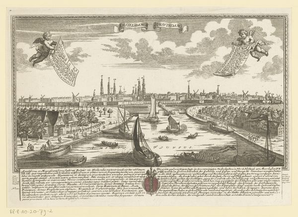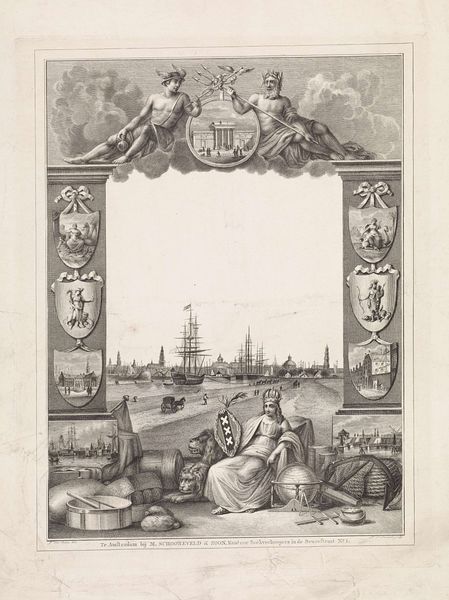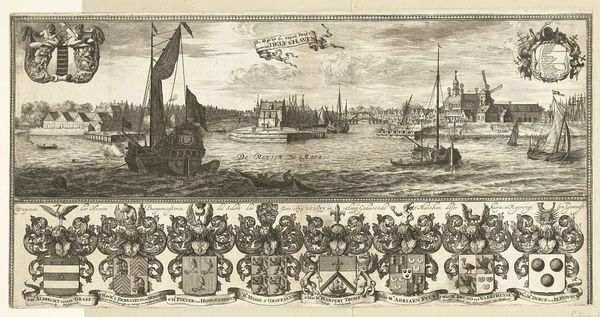 Editor: Here we have Coenraet Decker’s "View of Delfshaven with the coats of arms of the mayors of Delft in the year 1703," made with engraving techniques. It's fascinating how crisp and detailed everything appears, especially with the city's heraldry and nautical symbols. How would you interpret this image? Curator: This engraving teems with potent emblems! Consider the visual weight carried by the coats of arms, which speak volumes about civic power, familial legacy, and mercantile wealth within Delft. These symbols root us in a specific historical and cultural moment. Note, too, how Delfshaven, the 'holy harbor', bridges the terrestrial and the maritime worlds, representing not just a physical location, but a launchpad for Dutch global ambitions. Do you see how the artist uses this composition to connect Delft's local identity to broader worldly engagement? Editor: I hadn't considered that layered connection so explicitly. I was thinking about the ships, maybe about trade, but didn't fully consider "global ambitions". It's also interesting how the banners literally label elements of the picture plane. Curator: Precisely! And consider those banners—aren't they interesting symbols of self-declaration and municipal pride? Also, let's think about Delfshaven's role as a point of departure. Places of transition often become powerful symbolic sites, invested with hopes, fears, and the weight of countless journeys. Think about Ellis Island, for example, as another potent cultural symbol. In your view, what emotional undercurrent does the artist subtly embed within this representation? Editor: It now strikes me as a self-conscious portrait meant for posterity, highlighting a very particular historical moment. This harbor’s story goes far beyond its geographic coordinates, capturing Dutch aspirations during its Golden Age. Thank you! Curator: Yes! Visual texts preserve shared historical knowledge, revealing how Delfshaven encapsulates both tangible location and resonant collective ideals. I’ve learned to look at how cityscapes are constructed with intention.