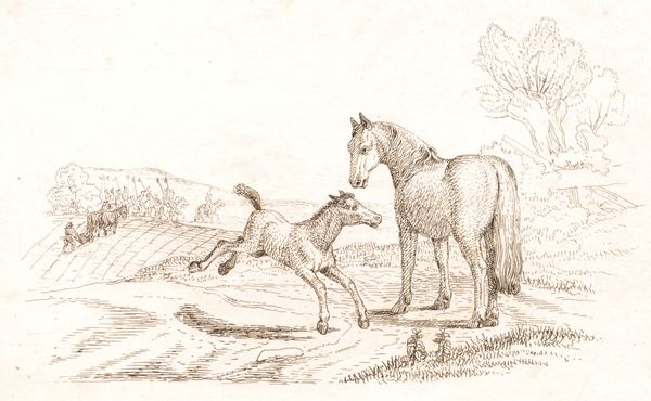 Editor: This is Martinus Rørbye’s "Illustration til \"Halvhundrede Fabler for Børn\" af Hey," created in 1834, using engraving. It features two horses, one appears to be a foal playfully kicking up its heels. It's such a simple scene, but the sketch-like quality gives it a sense of immediacy and energy. What do you see in this piece beyond the literal depiction? Curator: This unassuming illustration invites us to consider the relationship between representation and social context. Rørbye, working in a Denmark undergoing significant social and political changes, was contributing to a visual culture deeply intertwined with burgeoning nationalism. This image, initially, presents as an innocent portrayal of animal life. But consider the narratives embedded within. Editor: Narratives? How so? Curator: Well, we might ask: What fables were children being taught at this time? How did those stories reinforce or challenge existing power structures? This seemingly simple scene could reflect ideas about innocence, freedom, but also obedience, domesticity... Editor: So you're saying we can look at a drawing of horses and still see ideas about society? Curator: Absolutely. Visual culture doesn't exist in a vacuum. We can consider the position of childhood within 19th-century society. Also the position of animals, frequently used as allegory to talk about human social roles and morals. Where do you think gender might intersect with this reading? What about the ways class may be reinforced through depictions of nature and animal life? Editor: That gives me a lot to think about; I hadn't considered all those layers beneath the surface of something so apparently simple. It really highlights how even seemingly innocuous art can reflect broader cultural ideologies. Curator: Precisely. Art becomes a mirror, reflecting not just what the artist sees, but what society allows them – and us – to see.