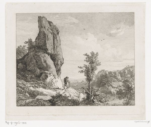 Hendrik Voogd’s ‘Ruïne met vergezicht’ is a drawing that presents us with a study in contrasts through its delicate lines and tonal variations. The composition, with its ruined structure in the foreground, immediately suggests themes of time and decay. The artist's application of line and shading directs our gaze across the landscape, creating a dialogue between the immediate and the distant. We see the ruin, meticulously rendered, perched atop a craggy outcrop that sharply descends into a valley, destabilising any fixed perspective. This play with depth evokes philosophical notions of the sublime, where the vastness of nature dwarfs human construction, challenging our sense of order. The drawing prompts a semiotic reading, where the ruin signifies not just physical dilapidation but also the transience of human endeavour. The vista behind, rendered with a lighter touch, symbolizes nature's enduring presence, questioning any idea of permanent structure. This work remains an open text, inviting viewers to find their own meanings within its finely wrought form.