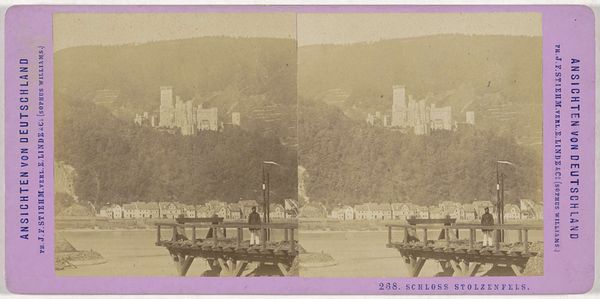 This is a photograph by Johann Friedrich Stiehm, capturing Stolzenfels Castle with the village of Kapellen on the Rhine. The composition is structured around a clear horizontal division, with the river in the foreground, followed by the village, and then the imposing castle perched on a hill in the background. Stiehm uses the river as a reflective plane, creating a doubling effect that adds depth and symmetry. The subdued, monochromatic tones emphasize the architectural details of the castle and the quaintness of the village. The formal arrangement invites us to consider how structures, both natural and man-made, define space. The castle, a symbol of power and history, looms over the village, suggesting a hierarchy and a narrative of control. This interplay of elements encourages a reading of the photograph not just as a depiction of a place, but as a commentary on social and spatial relationships.