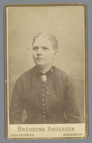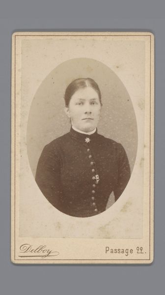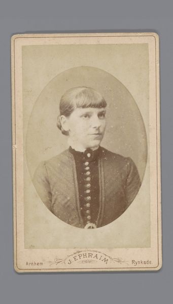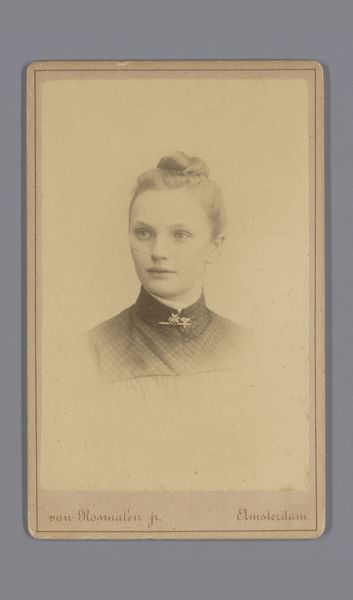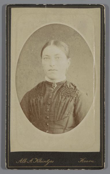 Editor: Here we have an albumen print entitled "Portret van een onbekende vrouw," or "Portrait of an Unknown Woman," created between 1883 and 1900 by Albert A. Kleintjes. I'm struck by her somber expression and the formality of the image. What narratives might be hidden behind this conventional pose? Curator: That's a fantastic question! Let's consider this portrait within its socio-historical context. Photography in the late 19th century became more accessible, yet it was still often a formal affair, especially for women. This woman's gaze is direct, but her lack of a clear identity, labelled as 'unknown', is telling. How might we interpret the power dynamics at play here, considering gender, class, and the gaze of the photographer? Editor: It's like she's been placed into a pre-determined role by both the photographer and societal expectations. Do you think that the formal style flattens any potential expression of her true self? Curator: Precisely! The sitter, in some ways, becomes a symbol, representing the constraints placed upon women of the time. However, looking closely, we can also read a quiet resistance in her gaze. Do you notice how she meets the viewer's eye? What could that mean in the context of restricted gender norms? Editor: That's a strong point. Perhaps her gaze challenges our expectations. Seeing her in this light makes me consider how historical context can provide us with richer insights into someone’s expression of identity. Curator: Exactly! It shows how important it is to look beyond the surface to see how someone reclaims themselves. Thank you. Editor: Thank you; it gave me a lot to think about.