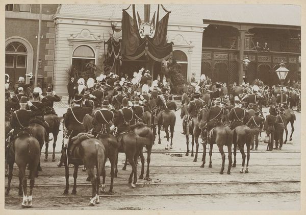 Editor: This is "Ere-escorte van Amsterdamse burgers bij de inhuldiging van koningin Wilhelmina," taken by Albert Greiner in 1898. It's a gelatin silver print, and currently held at the Rijksmuseum. It definitely evokes a sense of ceremony, doesn't it? I find myself wondering, what significance do you think this photograph held then, and perhaps holds now? Curator: It whispers of a time of change, doesn't it? Wilhelmina's inauguration marked the beginning of a new era for the Netherlands. But it’s also about civic pride, immortalized in this gelatin silver print. You can almost smell the wet cobblestones and hear the clip-clop of hooves. Photography in those days had a certain weight. What feelings stir within *you* when you view it? Do you sense the eagerness in the air, perhaps? Editor: I guess so. There's an anticipation of the future, though everything's rendered in a very…sepia tone of the past, of course. Why capture this specific moment, of the honor guard, rather than, say, the Queen herself? Curator: Ah, excellent question! It speaks volumes, really. By focusing on these Amsterdam citizens, Greiner highlights the connection between the monarchy and its people. The image almost asserts that the monarchy *relies* upon its people. Consider the rigid formality; it's carefully arranged. It tells a deliberate story about the young Queen and the Dutch population, now doesn't it? What do you think that story might be? Editor: That the power rests with the people, to some extent. That's really interesting! It seems like a pretty progressive message for that time. Thanks for pointing that out. Curator: Indeed! The past always surprises us, when we look closely enough. I feel like I've gleaned new perspective here as well. It makes one consider how fleeting such a monumental moment must be!