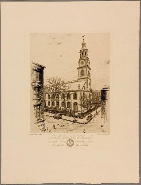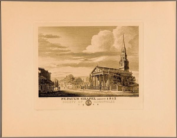 Editor: Here we have "Grace and Trinity Churches" by Sidney L. Smith. I'm really struck by the detail in this print. What's particularly interesting to you? Curator: As a materialist, I notice the printmaking process itself. The labor involved in creating such precise lines and details for mass consumption. Consider the social context: the Society of Iconophiles produced this. What were their goals, and how did this print serve them? Editor: So, you're saying the process and the society that made it are as important as the image itself? Curator: Precisely. The choice of medium, the intended audience, and the means of production all contribute to the artwork's meaning. What does it tell us about artistic labor and social values at the time? Editor: That shifts my focus entirely. I'm thinking less about the churches and more about the people who made this image of them. Thanks!