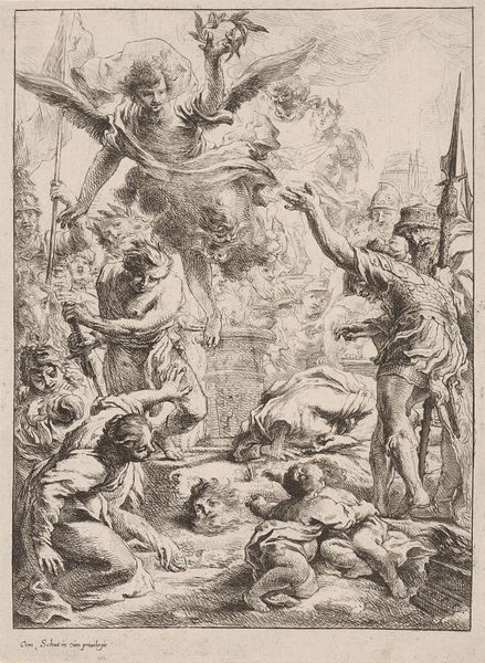 Curator: Standing before us is "The Burning of Troy," a painting executed around 1593 by Abraham Bloemaert, rendered in oil. Editor: It's... intensely dramatic. The flames leaping against that dark, almost black, sky, and the figures contorted in what seems to be despair and terror. Curator: The painting depicts a pivotal moment from the Trojan War, the sack of Troy by the Greeks, drawn from Homer's epic poem, the *Iliad*. Notice the emotional intensity in Bloemaert's rendition of this calamitous event. Editor: Definitely. But the focus isn’t really on the grand scale of war, is it? More the intimate suffering of those displaced and grieving. I see these small figures huddling together, clearly refugees in the chaos, while one woman raises her arms in seeming acceptance or perhaps denial. It feels deliberately intimate, less about glorious victory and more about the devastating consequences of conflict. Curator: Consider the figures arranged like statuary—the influence of Mannerism in the elongated bodies and theatrical poses. Observe how they interact and mirror elements from Greco-Roman sculptures. This isn’t just history painting; it’s invoking a whole visual lexicon from classical antiquity. Editor: That’s interesting because for me, that artifice clashes somewhat with the painting's supposed message of genuine suffering. It's like there’s a barrier. Curator: The artist, influenced by Northern Renaissance traditions, uses symbolism extensively. For example, the darkness surrounding the burning city contrasts sharply with the tiny moon – a beacon of hope or merely a cold observer of tragedy? The destroyed city symbolizes not just physical loss but also the collapse of societal order. Editor: And the active female figures are worth noticing. Their grief and terror signal both vulnerability and power, reminding us that in historical accounts, women are all too often sidelined from accounts of war. Curator: Indeed. This image reflects, not just a historical event but universal human experiences of displacement and trauma. The painting, through visual echoes and iconic symbolism, transforms history into myth and lived experiences. Editor: For me, the painting feels especially resonant given the current state of global affairs, especially the increasing numbers of displaced populations seeking safety, emphasizing art’s ability to remind us of cycles of history and humanitarian crises that are so ubiquitous, but still too easy to overlook.