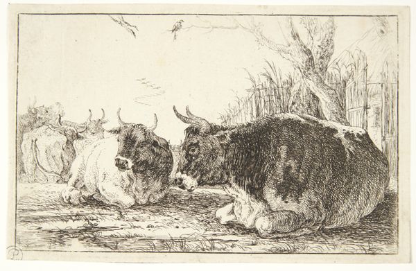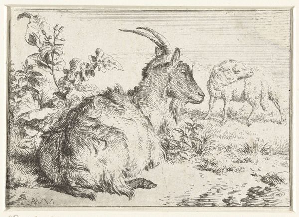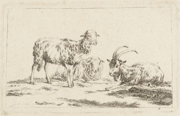 Editor: Here we have Nicolaes Berchem's etching, "from The Set of Sheep," likely created sometime between 1635 and 1683. It’s a rather simple image of two sheep in a field, rendered with incredibly fine lines. The textures in the sheep’s wool look really dense. I am intrigued to find out what's more here than just sheep grazing. What do you see in this piece? Curator: Well, it’s more than just sheep, isn't it? Berchem, who lived in a time of intense realism in landscape painting, seems to be inviting us into a moment of bucolic calm. The way he uses line to create those woolly textures – almost feeling like you could reach out and touch them – suggests a real fascination with the details of the everyday. It makes you wonder what Berchem was trying to convey beyond simple observation, doesn't it? Do these sheep represent something more to you? Editor: I hadn't considered a symbolic element beyond pastoral imagery. Now that I think about it, maybe they speak to ideas of domesticity and peaceful country living, especially during a time of societal upheaval? Curator: Precisely! Or even more personally, the sheep, basking in their wooly comfort, might prompt reflection on our own states of being. There’s a quiet invitation to find solace in simple existence, isn't there? We look at this little etching and suddenly, we're contemplating what it means to just...be. Editor: I’m beginning to understand this is a peaceful snapshot, maybe an allegorical reminder. Thanks, I will keep this perspective as I guide visitors! Curator: My pleasure; indeed a sheepish study of existence if I may say.