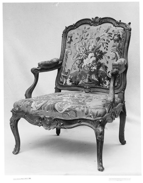 Curator: Let's take a moment to appreciate this armchair, one of a set of four, believed to be crafted sometime in the 18th century. It's currently held at the Metropolitan Museum of Art. What strikes you about it at first glance? Editor: It looks incredibly plush, almost excessively so. The densely packed floral tapestry practically vibrates, and the dark palette makes it feel somber, despite the lighthearted Rococo curves in the woodwork. Curator: Indeed. The Rococo style, which was at its height during this period, favored asymmetrical designs, flowing lines, and ornate decoration – all meant to express lightness and grace, a sharp departure from the more rigid Baroque period. These chairs likely adorned a room in a wealthy household, serving as both functional seating and a statement of refined taste. Editor: The upholstery is quite assertive, really dominating the form of the chair itself. There’s almost a tension between the wooden structure, which seems to want to leap and dance, and the fabric, which holds everything visually quite grounded. The contrast draws the eye from point to point around the form. Curator: Precisely. The choice of the Aubusson tapestry for upholstery speaks to a particular level of luxury. These tapestries were highly valued, created in a French manufacturing center, and were renowned for their detail and artistic quality. Having them on furniture signified not just wealth but also access to high-end craftsmanship endorsed, effectively, by the Crown. Editor: Do you think the rather serious coloration here—dark foliage with almost ghostly flowers—would have been as arresting then as it is to a modern eye? Curator: Color, its perception, and its political value, certainly held different weight. Sumptuary laws restricted the wearing of certain colors to specific social classes, for example. But yes, I think the interplay of light and dark in this particular chair might have stood out then, indicating a level of connoisseurship beyond simple display of riches. A carefully considered, almost scholarly aesthetic, maybe? Editor: Perhaps. And, as an object designed for a specific purpose within a larger space, I wonder how it informed social interaction... Curator: These chairs tell us so much about power, patronage, and the evolving idea of comfort.