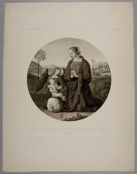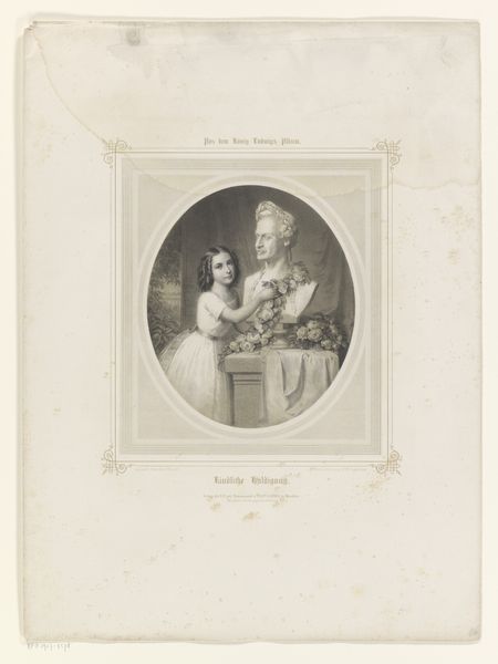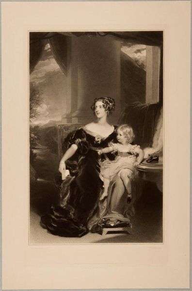 Editor: This is "A Woman and her Daughter" by Louis Pierre Henriquel-Dupont. It's a monochromatic piece, and it strikes me as a very formal, staged portrait. What's your take on it? Curator: Ah, yes. It’s more than just a portrait; it’s a glimpse into the artist’s soul, or perhaps the soul he wishes to project. Notice the way the light falls, almost caressing the figures, yet leaving shadows that hint at untold stories. I wonder, what are they not saying? Editor: That's interesting! I hadn't considered the unsaid stories. Thanks! Curator: My pleasure! Art is a journey, isn't it?