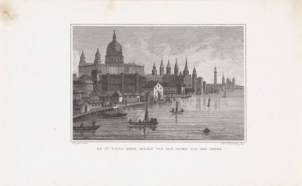 Curator: This is "Basle" by Charles Turner, an aquatint depicting the Swiss city. It’s held in the Harvard Art Museums. Editor: The tonal range here is quite striking; the sepia hues lend an almost dreamlike quality to the scene. The water looks still, the mood peaceful. Curator: Aquatint as a medium allowed for the subtle gradations of tone that convey that mood, and facilitated the mass reproduction of picturesque views like this. They were important for circulating ideas about place and nation. Editor: Yes, and the architecture is carefully rendered with attention to line and form, particularly the spire reaching upwards, creating a visual dialogue with the broad sky. Curator: Indeed, there's a calculated harmony. Turner’s prints helped shape perceptions of European cities for a growing middle class eager for travel and culture. Editor: It’s a very controlled atmosphere then. I notice that despite the boats and figures, there is still a distinct sense of calm. Curator: Absolutely. This print offers insights into the commerce of art and the construction of cultural identity in the 19th century. Editor: I agree. It's really interesting to see the image and then think of the history behind its creation and reception.