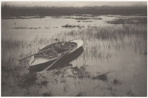 Curator: Welcome. Here we have "Drijvend nest van een zwarte stern bij het Naardermeer"—a photograph captured by Richard Tepe, likely sometime between 1900 and 1930. It portrays the floating nest of a black tern in the Naardermeer. What’s your immediate take on this piece? Editor: It’s a deeply serene and, frankly, melancholic image. The tonal range, confined mainly to sepia, creates a very subdued atmosphere, drawing the eye to the fragile nest in the midst of a wild landscape. Curator: Absolutely. Tepe employs a pictorialist approach here, where photography mimics the effects of painting, seen through soft focus and careful composition. Note how the reeds in the foreground frame the central subject, that nest with its precious contents. It’s all quite deliberately arranged. Editor: But the subject itself, a vulnerable nest floating exposed in the Naardermeer, speaks volumes beyond composition. What were Tepe's environmental politics at the time? A vulnerable animal such as the black tern likely means more to the photograph than just aesthetics. Curator: Pictorialism often sought to elevate photography to the status of fine art, concentrating on beauty and emotional resonance rather than stark documentation. Consider how the textures are rendered, with a noticeable emphasis on the play of light on water and foliage, further contributing to its atmospheric depth. Editor: But how complicit is beauty if it only acts to cover reality, as so often happens? The nest isn’t merely floating; it's fighting for survival, which has real political dimensions in our current epoch. By focusing too exclusively on technique, are we not potentially whitewashing those aspects? Curator: Not at all, for it’s through those techniques that he invites a profound connection with the natural world. He makes us contemplate not just the image but the broader sphere. Editor: I understand your reading but still see a sense of alienation. It's like a stage set with everything in its place, while in the real world those nests often succumb to various types of human interference. Maybe that’s where the true tension lies, hidden beneath Tepe's masterful artistry. Curator: Perhaps it’s in that tension between beauty and fragility where its enduring power resides. Tepe offers us both an aesthetic encounter and an invitation for something beyond. Editor: Agreed. Viewing art through an intersectional lens definitely enriches our understanding and can guide future actions toward preservation, awareness, and justice.