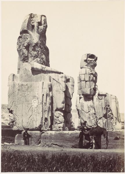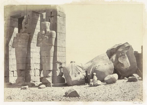 Curator: Félix Teynard’s "Djerf-Hocein (Tutzis), Hemi-Spéos, Colosses de la Partie Extérieure," a daguerreotype from 1851-1852, captures an ancient Egyptian site with colossal figures carved into the rock face. Editor: There's something so haunting about this image, a kind of monumental stillness. The way the light catches the rough-hewn texture of the sculptures makes them feel incredibly solid, grounded in the earth, almost eternal. Curator: It's fascinating to consider Teynard's process. Imagine the technical challenges of lugging such equipment to this remote location, creating a tangible record of a place then largely inaccessible. Editor: Absolutely, and what’s so potent is the way Teynard's photograph intersects with histories of colonialism and Egyptology. These early photographs contributed to the European gaze, shaping Western perceptions of Egyptian history. We must ask: who has the power to represent these artifacts, and whose story gets told? Curator: Precisely! This photograph acts as documentation, but is also art. Look at the skill evident in this early process. The chemical treatment of the plates, the precision required to achieve this clarity… Editor: I'm drawn to the depiction of labor. The creation of the original sculptures involved massive extraction of resources and the work of countless laborers. We’re seeing a legacy of that effort but only through the selective vision of a European photographer and colonial dynamics. The perspective leaves questions about exploitation, ownership, and who gets to claim history. Curator: These are key questions. Daguerreotypes were luxury items; their production and consumption served specific elite interests. Even in its early days, photography was far from democratic. Editor: This image invites reflection on photography's complex role as both a historical record and an instrument of power and the gaze. We're implicated in that history even as we stand here looking at it now. Curator: Precisely! These works allow us to contextualize not only an ancient moment, but a more recent one as well. Editor: It's a powerful, layered piece, resonating with colonial history. Curator: Indeed, a conversation starter about perception, process, and power.