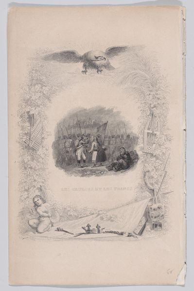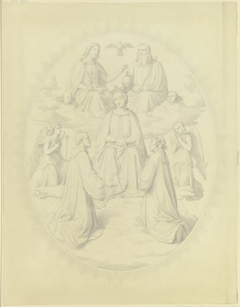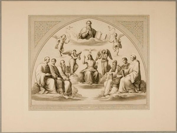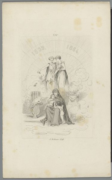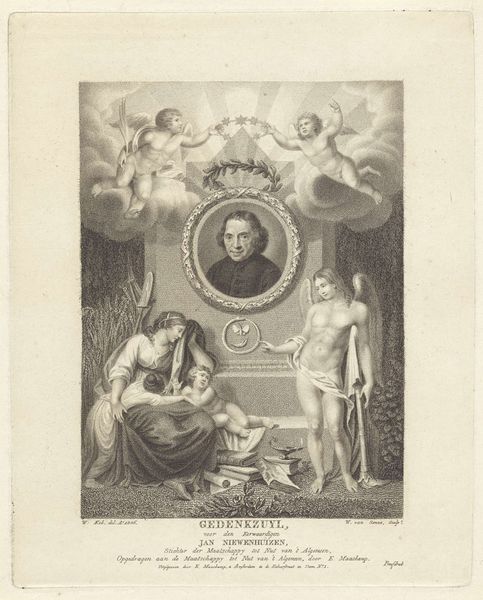 Curator: Here we have an allegorical representation, a print dating from between 1835 and 1898 by Gerardus Johannes Bos. It is titled "Allegorical Representation of the Establishment of the Louisa Foundation." Editor: The scene has an aura of restrained ambition. It seems meticulously arranged, yet somewhat faded in its idealistic expression. It feels like peering into a time capsule of aspirations, tinged with melancholy. Curator: Indeed. The piece layers the founder portraits, angels, buildings, and representations of virtue to establish cultural ideals through symbolic associations. Note the compositional mirroring from top to bottom, creating visual echoes across social tiers. How do these juxtapositions affect your interpretation? Editor: I observe a deliberate hierarchy with the founders elevated near divine symbols, and a street view in the midground flanked by allegorical scenes of charity and education. The power dynamic feels pronounced, reminding us of the context of philanthropy and social reform within an uneven society. Is it meant to inspire reverence? Curator: Partially. Allegories often reflect and reinforce prevailing value systems, aiming to educate by associating actions with their perceived consequences. The symbolism of the torch, crown, and accompanying figures offers moral instruction rooted in concepts like benevolence and good governance. These icons trigger pre-existing emotional and intellectual associations, don't you think? Editor: Precisely. By visually linking the foundation with symbols of royalty and divinity, the artist asserts the Louisa Foundation's legitimacy, subtly implying divine endorsement of its activities. The layout itself reflects the cultural values it attempts to solidify. It feels self-aggrandizing in retrospect. Curator: Such displays provided continuity in visual rhetoric for contemporary viewers. By adopting traditional visual motifs to validate new civic entities, they bridge the past with present ambitions, using visual shorthand to communicate legitimacy and purpose. Editor: It gives insight into how institutions in that era wanted to portray themselves, navigating visual signifiers to appeal to an audience with clear distinctions of power. It offers a poignant glimpse into the self-aware artifice underpinning so many institutions. Curator: A dense symbolic tapestry indeed! Editor: Quite insightful and indicative of its era, agreed.