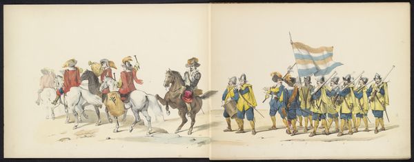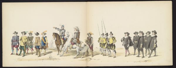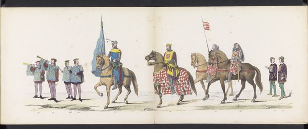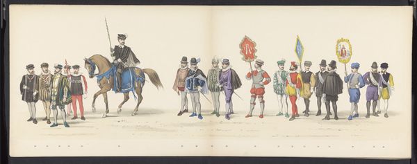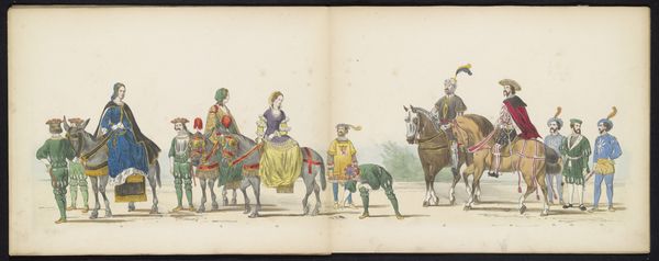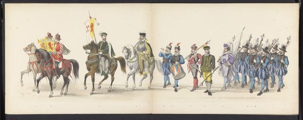 Curator: Looking at this watercolour illustration from 1865 titled "Maskerade van de Leidse studenten, 1865 (plaat 3)" by Jan Daniël Cornelis Carel Willem baron de Constant Rebecque, it certainly captures a theatrical, almost medieval scene. Editor: It has an air of historical re-enactment about it. The figures seem consciously staged, hinting at perhaps power dynamics or some sort of hierarchy. What draws your attention most about its materiality? Curator: The artist has rendered the different fabrics, from the heavy robes to the patterned horse blankets with impressive care. I find myself drawn to the materiality of these constructed identities. Notice the textures, the way light falls. It brings up questions of consumption, labour, and social distinction, as they are physically manifested. The artist seems preoccupied with these constructed identities and their associated status. Editor: Indeed. The layering of costumes and their colors also suggests something deeper, maybe allegorical commentary of society. These Leiden students and the ways in which they perform historical garb seem laden with symbolism. This parade reflects the intersection of identity, gender, race, and politics of 19th century Dutch culture, doesn't it? I want to investigate whose narratives are being highlighted here. Curator: It certainly prompts many considerations on the performance of identity and social roles through garments and pageantry. We have people standing as markers of this culture while we look at its representation through watercolour illustration. Editor: It really forces us to ask ourselves: what stories are being retold, and who has access to history? Curator: And equally important, how does this relate to our culture of fashion and costuming? What has remained and changed? Editor: These questions push us towards the broader intersections and contexts of performance, presentation, power and visual markers of difference across various fields and studies. Curator: Looking again through its medium and craftsmanship, it serves both as a window into its culture, and something we must be critical of as viewers ourselves. Editor: It provides that fascinating space for interrogation between the past, present and our possible futures.