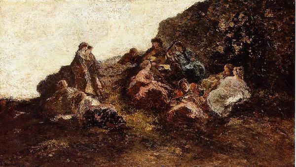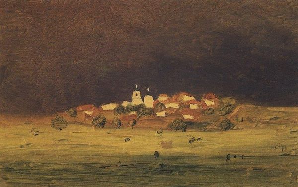 Curator: Let's take a look at "Mountain slope. Crimea" by Arkhyp Kuindzhi, painted around 1890 using oil on canvas. What are your first thoughts? Editor: Stark. The abrupt transition from a radiant hilltop to almost complete darkness evokes a rather disquieting mood, despite its surface beauty. Curator: Precisely. Consider how the painting embodies impressionistic plein-air techniques. The handling of light and shadow, and the quick, visible brushstrokes aimed at capturing the fleeting effects of nature… Editor: While that’s true, its realism tempers that effect. There’s a tangible, weighty feel to the rocks, and even the scrubby vegetation seems stubbornly earthbound. Doesn't the stark contrast create an unsettling division between the visible, illuminated world and a realm of obscurity? Curator: Indeed. Light in Kuindzhi's landscapes serves as more than a mere optical effect; it functions almost symbolically, illuminating the details of a particular space, like in this Crimea scenery. The painting also embodies key debates of that time; realists embraced naturalism while artists associated with impressionism tried to capture subjective interpretations through fleeting sensations and fragmented forms. Editor: Fascinating to think of that tension playing out here on a single canvas. Looking at the scene depicted, I wonder about the absence of human presence. The scene appears undisturbed and timeless. Perhaps this adds to the somewhat alien feeling despite the familiarity of landscape. Curator: That feeling ties directly into Crimea’s historical status as contested territory—subject to wars and imperial ambitions. The image perhaps alludes to both the region's exposed and fragile beauty. Its elevated positioning highlights the land's precarity in the face of continuous geopolitical struggles. Editor: I now recognize the work on an even deeper level. In this light, Kuindzhi’s treatment of light becomes even more resonant, symbolically representing both illumination and potential shadows for the fate of Crimea itself. Curator: It's extraordinary how analyzing artistic techniques and its historic context changes our understanding of the piece!