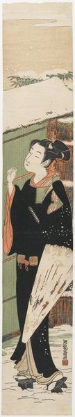 This is Torii Kiyonaga's "Woman Walking under a Store Sign," a woodblock print made in Japan. The vertical composition focuses on a standing woman, rendered with delicate lines and subtle color variations, that create a sense of elegance and serene movement. The gentle asymmetry is critical to the piece’s overall dynamism. The woman's figure, slightly off-center, is balanced by the architectural elements of the store sign above her, establishing a visual rhythm. The soft hues, dominated by muted blues, pinks, and oranges, create a harmonious yet restrained palette. This reflects a broader artistic concern in ukiyo-e prints with capturing ephemeral beauty and fleeting moments of everyday life. The intricate patterns on her kimono and the detailed rendering of the store sign introduce a semiotic system of signs. These visual codes invite the viewer to decipher the cultural narratives embedded within. The artwork challenges fixed notions of beauty and representation by capturing the transient nature of urban existence.