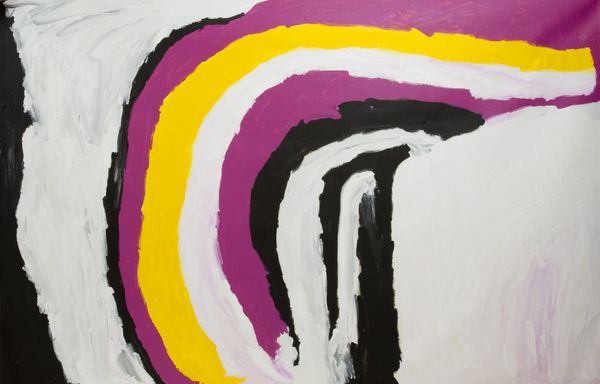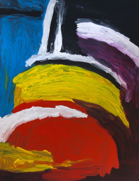 Curator: Immediately striking is its confident brushwork; bold colors thrown into forms that suggest something but remain abstract. Editor: We are looking at “Dibirdibi Country”, a 2011 painting by Sally Gabori. It's acrylic on canvas. Gabori was an Indigenous Australian artist, and her work speaks volumes about the history of her community and the political landscapes she navigated. Curator: Absolutely. It’s hard not to see the physicality of the paint itself, those thick strokes, and how the white almost fights with the earthier tones for dominance. There is very little blending and very defined brushstrokes. I wonder what kind of brushes or tools she used to create these specific textures and volumes, so dense, giving a three-dimensional quality. It pushes painting almost into the realm of sculpture. Editor: Gabori’s art emerged rather late in her life and quickly gained recognition, largely due to its perceived authenticity, and the powerful story of cultural resurgence that underpinned her practice. However, let's remember, museums and galleries played a vital role in constructing that narrative for wider consumption, both good and bad, no doubt. Her works gave visibility to stories from Bentinck Island after its inhabitants faced displacement due to a cyclone, and forced resettlement at the Presbyterian Mission settlement on Mornington Island in 1948. Curator: It's a beautiful thing, to think about this art as bearing witness, or bearing a connection to a specific place and time through materiality, particularly since she seems to resist obvious literal representation. Editor: How Gabori translated her connection to Country onto the canvas tells not only a personal history but reflects a collective experience shaped by displacement and government policies toward indigenous populations. In turn, how that artwork, and Gabori herself, was interpreted by the art world contributes to Australia’s broader historical narrative. Curator: Indeed, so much is embedded in the paint and how it was applied, giving physical form to lived history, of personal experiences as well as broader social forces at work. Editor: Thinking about Gabori’s legacy in the canon of Australian art forces us to confront the ongoing challenges of representation and the politics inherent in any act of cultural preservation. Thank you for making that come alive in this artwork.