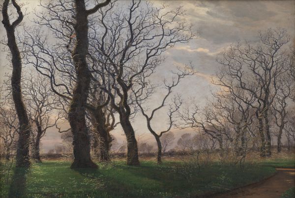 Albert Gottschalk painted "The Citadel in December," an oil on canvas, capturing a path leading toward a distant building. The bare trees, like skeletal arms, reach towards the sky, framing the scene with a sense of starkness. Consider the path, a motif stretching back to antiquity. It symbolizes life's journey, the choices and destinations we face. We see this echoed in medieval allegories, where the path represents moral decisions, or even in the Romantic landscapes where it signifies the sublime's pull, a solitary figure dwarfed by nature's grandeur. The path here, however, leads into a muted, almost melancholic light. It's a more internalized journey. The bare trees suggest a psychological stripping away, a confrontation with the essential self, mirroring the introspective moods often evoked by winter landscapes. This image speaks to a deep, collective memory, a recognition of nature's cycles and our own human experience reflected in them. It's a visual echo, resonating with the emotional weight of countless journeys taken, both literal and metaphorical.