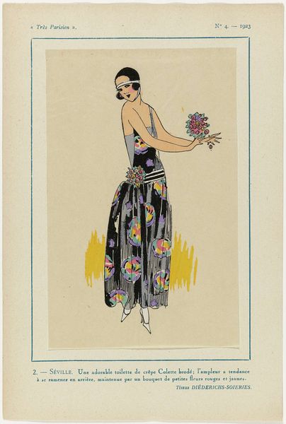 Curator: This intriguing print is titled "Très Parisien, 1923, No. 3: Tissus de A. PRÉVOST...Rubans de Grenade." It resides in the Rijksmuseum's collection. Editor: My first impression is one of elegant simplicity, but then the dress fabric really jumps out. It's a striking decorative pattern with defined lines against the figure’s graceful pose. The illustration gives a peek into a specific cultural moment in Parisian fashion. Curator: Absolutely. Let's delve into the material aspects of this piece. We are looking at a mixed-media work; combining drawing, watercolor illustration, printmaking techniques, and what appears to be the integration of actual textiles. Editor: Yes, the presence of "Tissus de A. PRÉVOST" in the title points to the importance of the fabric. The print becomes a kind of advertisement for the textile industry, which played such a significant economic and cultural role in Parisian society. Curator: Precisely. It's fascinating to consider the labor involved, from the design of the textile itself, produced by A. PRÉVOST, to the production of this print showcasing the final product in the hands of its consumer. This goes beyond the presentation of mere imagery, we see fashion become accessible, almost attainable, to its audiences. Editor: That’s an astute observation about accessibility. These types of images, published widely in magazines, democratized fashion and brought the Parisian style to a broader public, influencing tastes and trends far beyond the elite circles. They contributed to the development of consumer culture as well as the popularization of “art deco." Curator: Further solidifying the important relationship between creator and patron, maker and consumer, where design and artistic creation collide. Editor: This single image, therefore, presents a rich case study on not only 1920's fashion but on broader aspects of art production and consumption within French society. It acts as an amazing reminder to study further the power that images exert on a large and complex network of culture, and how their effects reverberate. Curator: It indeed encourages further reflection and a wider exploration of what’s represented. A true testament to how objects preserve moments in our shared human experience.