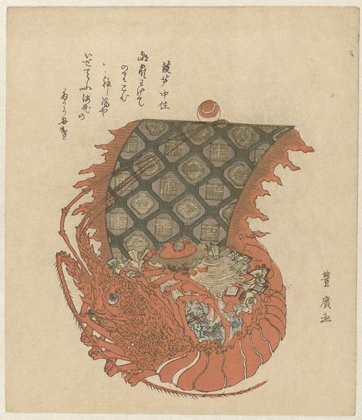 Editor: This intriguing piece is called "Painting of Peacocks, Waterfall and a Red Pillow" by Toyota Hokkei. It seems to be a watercolor print in the Ukiyo-e style. The layered effect and the vibrant greens in the peacock feathers create an unusual sense of depth and flatness simultaneously. What strikes you about its composition? Curator: The first thing that seizes my attention is the interplay between foreground and background. Note how the flatness of the pillow, rendered in a stark, almost geometric red, challenges the perspectival illusion of the waterfall behind the peacocks. The inscription, also, isn't just informational—its presence on the left plane introduces a semiotic element, inviting us to decode the relationship between the visual and the textual. Editor: So, the placement of the inscription is deliberate, influencing our interpretation? Curator: Precisely. Consider the relationship between the vertical script and the cascading lines of the waterfall. Is there a mirroring effect? Or perhaps a counterpoint? Further, we should explore how the textures – the coarse grain of what appears to be the support for the peacocks, the smooth expanse of the pillow, the feathery brushstrokes rendering the peacocks themselves - contribute to a unified, if complex, aesthetic experience. Does the artist aim for a harmonic or deliberately dissonant interplay? Editor: That's fascinating. I was focused on the imagery but now I see how the various compositional elements create meaning beyond just the representation. Curator: Indeed. The relationship between representation and abstraction becomes crucial. How much does the ‘peacock’ signify, and how much does it serve as a formal element within a constructed visual space? Editor: I hadn’t considered the piece with such a focus on its materiality and how each part relates to the others. It offers much more than a first glance reveals. Curator: Indeed, reflecting on the intrinsic elements and formal composition has made me consider it as more than just a narrative.