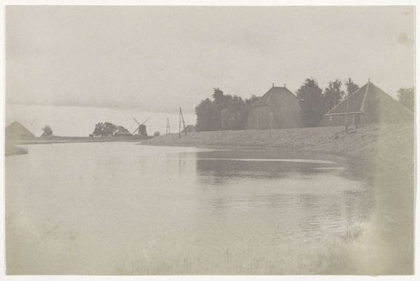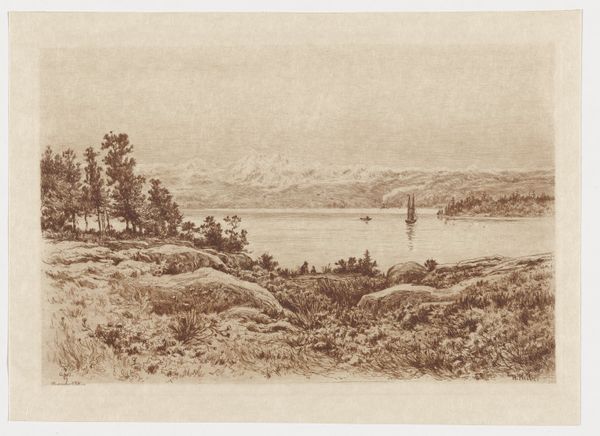 Editor: Here we have Charles Adams Platt's "A March Evening," an etching dating back to the 19th century. There's a still, quiet mood about it – a stillness in the water, under a very subtle sky. What symbols or visual motifs strike you when you look at this piece? Curator: Well, immediately I see a landscape pregnant with cultural memory. Notice how the horizon line is low, almost subservient to the sky? It hints at a kind of vastness, perhaps a subliminal echo of the American sublime that permeated art of this period. And those sparse dwellings atop the hill? They seem vulnerable, yet stoic, perhaps symbolic of human endurance. What do you make of the skeletal trees reflected in the water? Editor: They seem to reinforce that stillness – that it is indeed "A March Evening" – the tail end of winter still clinging on. They seem to represent dormancy. What about the water? Is it simply water? Curator: Water, in its stillness and reflectivity, often embodies the subconscious, the dreamlike space where reality and illusion blur. Here, it mirrors the scene, doubles it, almost questioning the very nature of reality. It may ask us, "What is real and what is mere projection?" Notice the reeds, too. How they emerge like dark thoughts from the depths. It evokes introspection, doesn't it? It could serve as an existential stage set of reflection. Editor: It's interesting how you read so much symbolism into such a seemingly simple landscape! I wouldn't have noticed all of that by myself. Curator: The beauty of art lies in its layered meanings. It's rarely just what we see at first glance but what it triggers deep within our collective unconscious. Editor: Thanks to your insight into this artwork, I now recognize some visual symbolism behind it. Curator: And that is what makes art exploration so satisfying!