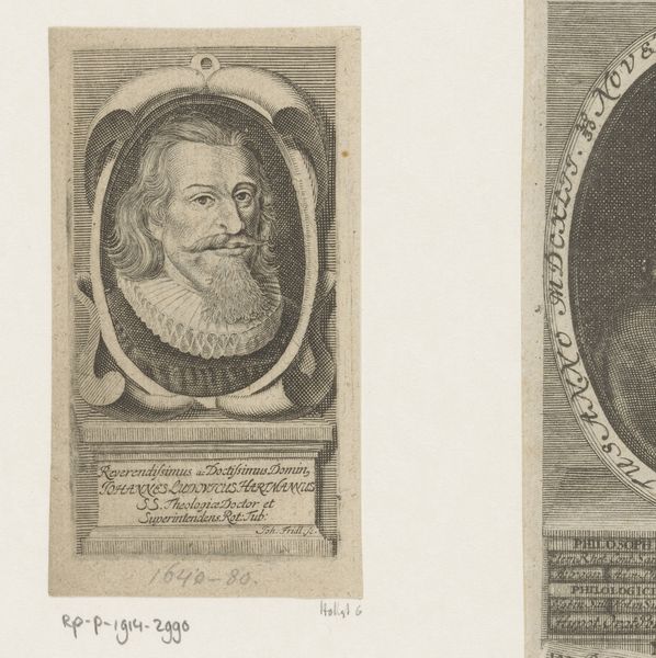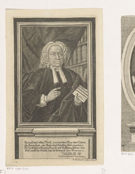 Curator: Here we have Martin Bernigeroth's portrait of Pierre de Villiers, likely created between 1680 and 1733. It's an engraving, currently held here at the Rijksmuseum. Editor: It strikes me as quite rigid. The starkness of the lines, the formalized pose. A little severe, almost? Curator: Baroque portraiture often leans into the hierarchical representation of the sitter. Look at how Bernigeroth employs line to create the texture of the fabric; observe how the oval cartouche both confines and elevates de Villiers. The composition centers on de Villiers, Prieur de St. Taurin dugrand Ordre des S. Benoist. Editor: You're right, that controlled composition communicates power. The meticulous details of his garments, even the lettering below... It’s not just an image; it’s a declaration. And what about the choice to frame him within an oval? Is it about containing his presence or emphasizing it? Curator: An interesting point. I see the oval functioning as a means of isolating the figure, almost lifting him out of his immediate context. This adds to the sense of importance, doesn't it? Note too, how Bernigeroth makes use of background gridlines to both center de Villiers and keep the sitter in balance with the dimensions of the portrait itself. Editor: And this presentation – the portrait itself mounted on what looks like a small pedestal complete with his name – really emphasizes how it's intended for public consumption, a visual reminder of his authority. We have a powerful church leader memorialized here, made enduring. Curator: Indeed. Considering the function of portraiture in that era, it would serve to amplify his importance. Bernigeroth has left us with a structured view into that world. Editor: I'm walking away feeling more attuned to how power and imagery were intertwined then. Curator: Exactly, the lasting legacy of this Baroque print lies not just in its subject but in its demonstration of formal artistic codes of its time.