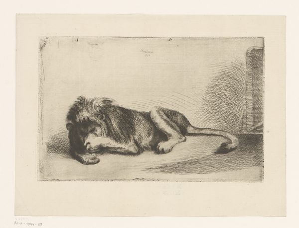 Curator: Here we have "Head of a Resting Lioness," an etching made sometime between 1878 and 1913. Editor: It’s somber, isn’t it? The lioness seems caught between weariness and vigilance. Her eyes, especially, have this knowing depth that feels… weighty. Curator: Exactly. Consider the context of its creation. During this era, European colonial power was at its peak, extracting resources and exoticizing the wildlife of Africa. How does the artist’s decision to depict the lioness – an emblem of power reduced to a state of repose – speak to those dynamics? Editor: The lion, traditionally a symbol of strength and royalty, often masculinized... here presented as a female, and subdued. There is something about the choice of this particular animal rendered so softly that encourages the viewer to empathize and reflect on how we view wild creatures, our cultural projection of majesty. Curator: Yes, it is very loaded. Even the printmaking technique adds layers to unpack. The detailed linework creates texture, yet the monochrome palette evokes restraint, suggesting both intimacy and detachment in equal measure. Is it a study of raw nature, or does it signify loss and vulnerability under Western eyes? Editor: Absolutely! We load these images with the baggage of our cultural assumptions. Etching lends itself to intimacy – and also invites distance. Curator: What fascinates me is this lioness transcends her time. In contemporary discourse, we constantly interrogate whose stories are amplified. And the subject position, the female form made docile in this context is ripe for inquiry, still relevant now. Editor: Yes, a visual symbol with so much embedded history, always evolving in meaning and speaking to our evolving understanding. It causes me to ponder about the way we immortalize ideas through images and the feelings associated with that image, as we encounter it again in different points of time. Curator: Precisely! "Head of a Resting Lioness" reveals how our interpretation of visual representation intersects with critical examination about identity, history, and enduring social themes. Editor: The etching urges me to reflect how we can perceive strength in an apparently submissive stance, challenging conventional visual narratives.