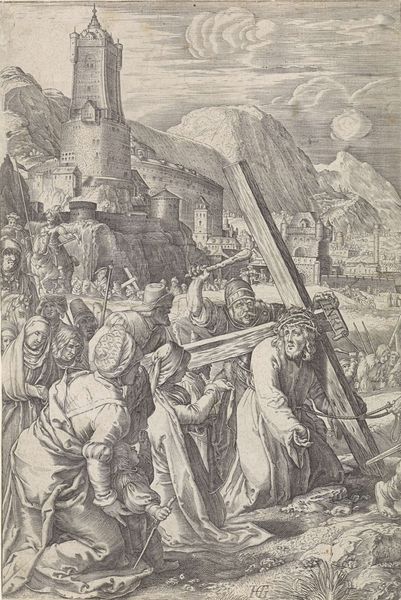 Editor: This is Abraham Hogenberg's "Christ Carrying the Cross." It's an engraving, so the lines are incredibly precise. What's striking is the tension between the fine detail and the raw emotion of the scene. What stands out to you about the materials and production? Curator: The material reality of the wood of the cross, the metal of the implements of torture—these aren't just symbols. How does Hogenberg's printmaking process, the labor involved in each etched line, influence our understanding of the suffering depicted? Editor: That's a good point. The sheer work that goes into creating this image mirrors, in a way, the physical burden Christ bears. Curator: Exactly. Consider the role of the printing press itself. How does the mass production of this image, its circulation, impact the message and the consumption of religious narratives at the time? Editor: So it becomes not just a religious image, but a commodity, right? Something to be bought, sold, and traded. Curator: Precisely. Reflecting on this print, I’m struck by the link between artistic creation and economic systems, both then and now. Editor: I hadn’t thought about it that way before. The process becomes another layer of interpretation.