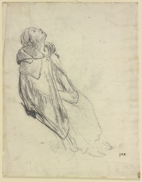 Curator: This drawing, attributed to Wilhelm Steinhausen, is titled "Standing Young Man in a Long White Robe and a Blue Cloak." It’s currently held here at the Städel Museum. Editor: My first impression is the sketch-like quality and understated grace. It feels more like a study for a larger work. Curator: Exactly. The work on paper involves chalk and pencil and perhaps some watercolor as well; it speaks to the economy of materials during the 19th century while showcasing Steinhausen’s capacity to conjure form and feeling using very basic means. Editor: It raises a question about labor. Was this piece a paid commission or personal exploration, a leisure pursuit? Was Steinhausen experimenting with new ideas, new identities, reflecting societal norms around male gender? I think that blue cloak especially evokes historical and cultural weight, linking to ideals, perhaps. Curator: It is intriguing to speculate. Looking at the composition, I note the delicate pencil work defining the figure's pose, then the soft shading. It seems almost like a classical contrapposto stance under the drapery, yet rendered with an immediacy we associate with modern sketch work. Editor: Agreed. The incomplete nature adds to the immediacy. And think about how “whiteness” in the robe functions. White symbolizes innocence or purity. Is this a romanticized portrayal of youth disconnected from the social realities of the time? Curator: Or could it be an exercise in depicting fabric, given the artist's apparent interest in how it folds and drapes? The texture of the cloth conveys so much, even without elaborate detailing. Editor: But that textural attention could underscore class and privilege. The texture implies access to these refined materials…the labor involved in production. Even sketches of this nature reinforced specific power dynamics. Curator: That's an interesting perspective, highlighting the silent social commentary embedded within artistic representation. Editor: Ultimately, looking beyond face value and into what informs artistic decision-making is important. I walk away seeing Steinhausen's work not as simple draftsmanship but a window into artistic practice, class assumptions and representation during his lifetime. Curator: Yes, a reminder of the many hands, seen and unseen, that give artworks and those depicted life and resonance through materials and technique.