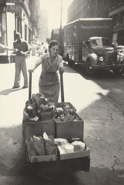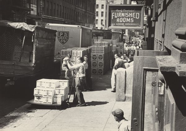 Editor: This photograph, taken in 1908 by Lewis Hine, is titled "Lena Lochiavo - 11 years old, basket (and pretzel) seller, at Sixth Street Market in front of saloon entrance, Cincinnati, Ohio." There’s a sense of both hope and hardship captured in her gaze, juxtaposed against the backdrop of what looks like a bustling market. How do you read this piece, considering the historical context? Curator: Hine’s work often serves as a powerful indictment of social conditions. By explicitly documenting Lena’s age and her work, and positioning her beside a saloon, Hine highlights the precariousness of childhood within specific social and economic environments. Consider the choices inherent in the composition; the framing suggests the saloon’s potential influence, the baskets hint at a family in need. It encourages us to question the norms that allow such precarity to exist. Do you think the photograph is meant simply to record or to actively provoke change? Editor: It feels like a direct appeal. It is not a detached observation, it’s advocating for something. Perhaps to elicit public condemnation. Did Hine’s work succeed at changing attitudes toward child labor? Curator: Absolutely, Hine's photographs were instrumental in shaping public opinion and influencing legislation aimed at protecting children. The National Child Labor Committee employed these images precisely for that purpose. Think of Hine as consciously crafting and using photos for a particular socio-political outcome. By focusing on individuals within larger societal systems, his images fostered empathy and revealed the human cost of industrial progress, contributing significantly to the Progressive Era reforms. It wasn’t merely art for art's sake, but rather art as a tool for social change. Editor: That gives me a different perspective on the agency of art in social discourse. I see the photographer as a powerful agent now. Curator: Exactly. Understanding the historical function, intent, and the audience for images is critical for deciphering its total meaning. There is always a sender, a receiver, and a method of communication at play. Hine clearly shows how social change can emerge via photographs.