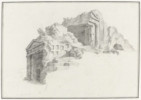 Curator: Here we have Aniello Falcone's "Ruins of the Roman Arena at Pozzuoli," an etching in ink that, despite its age, feels incredibly present. I would estimate it was made sometime in the mid-17th century. What's your initial impression? Editor: Haunting, I think. The level of decay almost overshadows the monumentality that surely was intended in its original construction. It evokes questions about power, loss, and what remains after societal shifts. Curator: Exactly. Falcone's focus wasn’t on the grandeur, but on time’s inevitable effect. Consider the use of ink; the faded brown ink echoes the crumbling stones. In many ways it also emphasizes how power fades, even ruins turn into icons of the past and of memory. Editor: It's a striking commentary on the ephemeral nature of power, particularly male displays of power in public arenas throughout history. Arenas like this, they were sites of brutality but also community. It almost feels like he’s capturing the moment where that duality collapses. Curator: Indeed. I'm drawn to how the vertical lines, likely indicating columns, still hold their rigid form, in spite of being worn away by time. The endurance of the structural memory of a time gone by is interesting, right? These fragments whisper of the past. Editor: Absolutely. And those jagged edges, those openings, the deep recesses of the arches are incredibly evocative. You think of the stories those stones could tell if they could talk. Now the animals graze peacefully as any potential audience has long departed, the ruins stand to me as a symbolic statement. It has returned back to its origins. Curator: A poignant observation. There's a definite layering of eras happening. Editor: Yes. In this regard, ruins are visual metaphors, inviting contemplation on time, civilization, and ultimately, human fallibility. Curator: It is truly something to experience. This arena, now captured through Falcone's careful hand, inspires a deep appreciation of the historical narratives art so subtly conveys, don't you think? Editor: Undeniably. Seeing the marks of erosion as testament rather than defeat is certainly compelling. I can better appreciate its enduring power now.