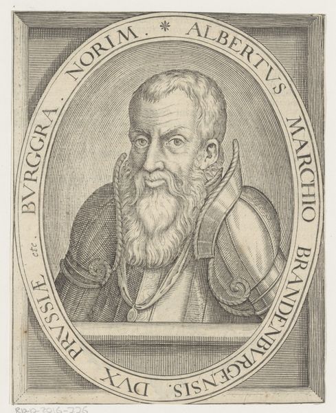 Curator: Hanns Lautensack created this print of his father, titled "Paul Lautensack, Father of the Artist." Look closely at the detailed etching. Editor: The intricacy is remarkable. Even in monochrome, it captures such texture and age. I sense an immense amount of respect and admiration for the subject. Curator: The ornate frame around Paul, combined with the lettering, speaks to the humanist traditions of the Renaissance. It’s almost as if the frame itself is a memory palace, an archive of familial respect. Editor: But aren’t these kinds of portraiture also about class? About announcing status? Who gets remembered, and why? The visual language is beautiful, but we need to think critically about the narrative it creates. Curator: That’s a valid point. Considering its context, the portrait could indeed function as a status symbol. It is in the Harvard Art Museums, but the work certainly evokes the power of representation through lineage. Editor: This makes me want to investigate the cultural forces that shape artistic legacies. Thanks for pointing out this piece. Curator: Likewise. It’s always interesting to consider how symbols reflect broader cultural narratives.