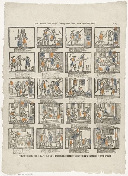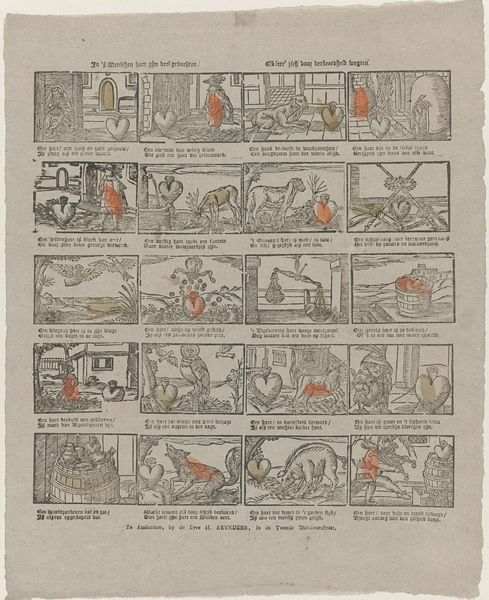 This series of prints depicting ‘Thijl Uylenspiegels Leven en bedrijf’ was created by Johannes Kannewet. The composition is structured as a grid, organizing each scene of the narrative into small, self-contained squares. The use of line is striking; each episode is sharply delineated, creating a sense of order. The minimalist use of colour—primarily blacks, greys and reds—serves to emphasize form and detail, drawing attention to the stark contrasts within each vignette. This simplicity invites us to focus on the shapes and relationships between figures and objects, prompting us to interpret the narrative's progression through visual cues alone. Kannewet’s style is rooted in the tradition of printmaking. The semiotic use of signs, rendered in graphic form, challenges the idea of fixed meaning. This allows for a multitude of readings, reflecting the ever-changing societal interpretations, and re-interpretations, of the original stories. The grid structure, combined with stark visual contrasts, presents the episodic nature of life as a series of structured yet open-ended moments.