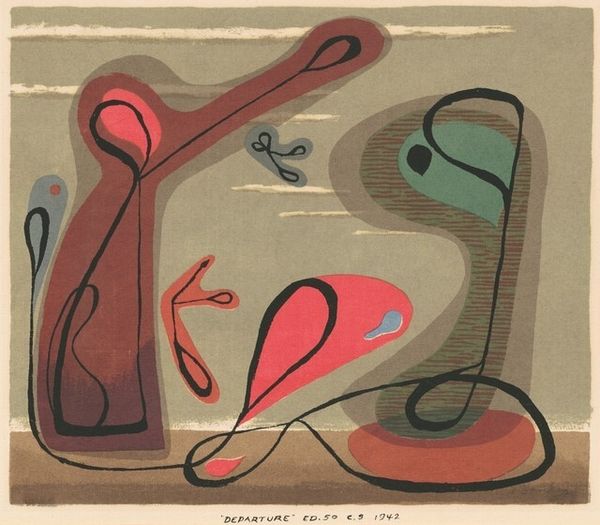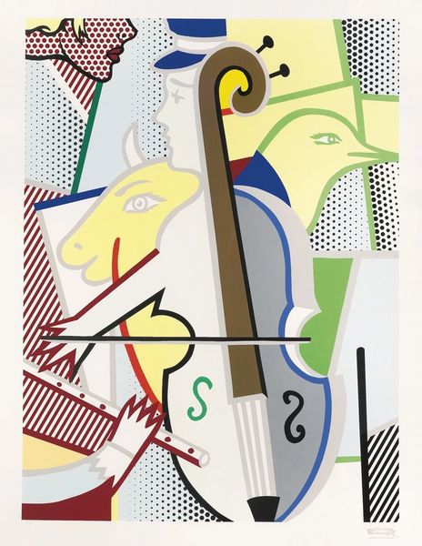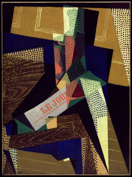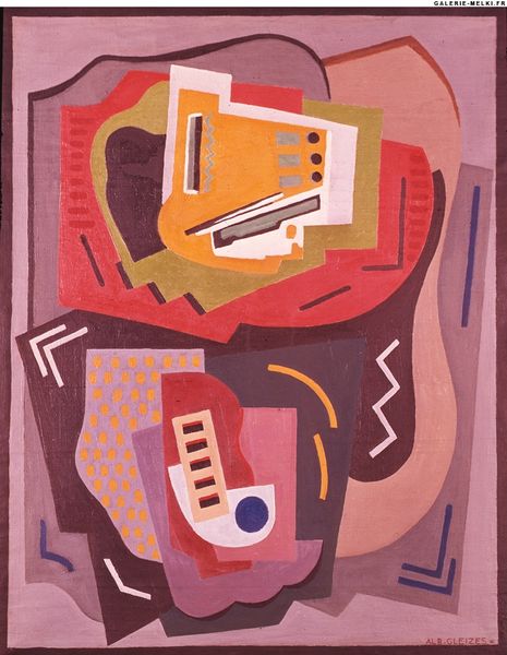 Curator: At first glance, the juxtaposition of floral arrangements, a mandolin, and geometric tools feels a bit chaotic. The hard edges feel a little jarring against the softer organic shapes. What’s your impression? Editor: It’s visually arresting, I’ll grant that. There’s something unsettling, yet lively in the picture. Curator: Lively is a good word for it, actually! The work is a mixed-media painting by Gino Severini titled "Flowers and Masks," dating from 1930. Severini, of course, being one of the leading figures in the Futurist movement. Editor: Futurism... I can see that, in the dynamic composition and fractured perspective, a love letter to modernity. How do you see the symbols here resonating with the anxieties or ambitions of the time? Curator: The flowers could reference beauty or the natural world, but there's also an inherent fragility and decay to flowers as well. While the tools are a direct and powerful reference to scientific progress. Also I cannot forget the musical instrument. It brings melody into such hard geometry and maybe suggests the continuity of tradition? Editor: Right. I like that interplay of the old and new. Severini and the Futurists wanted to capture the dynamism of modern life and reject tradition and political neutrality. Curator: Certainly, and here those conflicting interests feel almost palpable. Take for example the flowers - they are very much flowers that belong to a traditional still life but they are being represented with clear influence of Cubist methods! Even the cityscape painted below is angular! And look at the limited palette he employs! This suggests that, for all his ambition to innovate, he has stayed rooted in established painting traditions. Editor: Yes. Perhaps Severini acknowledged more implicitly than other Futurists how tradition persists despite our best efforts. It serves as an artistic bridge between epochs and a reflection of cultural change, right? Curator: Precisely, It invites you to appreciate that complexity, the dance between past and future, that persists in the visual arts to this day. Editor: This painting becomes a time capsule, doesn't it? Something worth reflecting on.