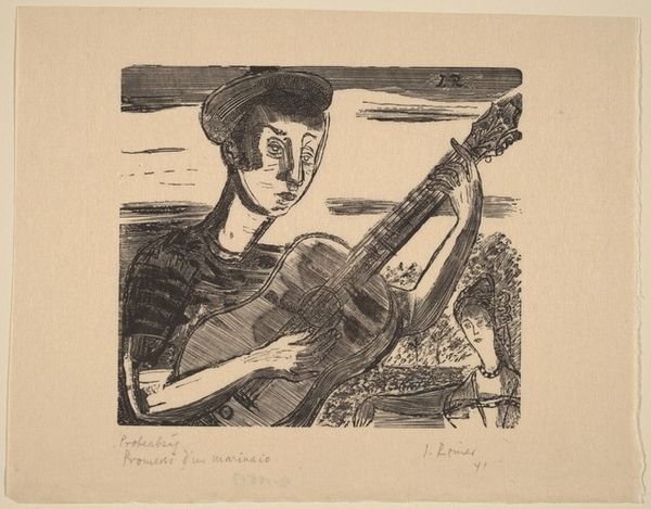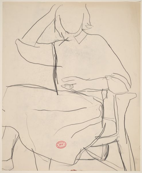 Curator: Today, we're looking at "Seated Boy with Lute," a pencil and ink drawing. Editor: My initial reaction is that it’s a tender, yet unfinished study, wouldn't you say? There’s a vulnerability in its spareness, with so few lines forming the boy and his instrument. Curator: Indeed. We can consider it within Rothko's broader practice and the prevailing discourse of the early 20th century. How do themes of class, labor and access intersect in an artwork depicting a boy and his instrument? Are we seeing an affirmation, or perhaps a constrained reality? Editor: I see your point about social realities, but I am captivated by the physical creation here. Pencil on paper, the careful gradations achieved with just line and shading. How labor-intensive were these types of drawing at that moment in history and to what extent did these impact the culture? It's interesting to explore these. Curator: That’s fascinating to note how this simple piece allows us to probe these connections and to examine the construction of value and artistic skill, challenging the traditional hierarchies of art. What is included or not included matters. What statements about the model can we derive when he’s only an outlined image. Editor: Definitely. The economic and cultural accessibility of these inexpensive methods offers us insights. By carefully attending to it, the sketch becomes a portal, telling us so much about the making and maker as well as the culture in which it was produced. It begs to be interpreted. Curator: Looking closer at this pencil and ink sketch, then, offers not just an appreciation for artistic technique, but also opens a door for us to think about social power, how these forms are distributed and regulated within culture and in everyday life. Editor: Absolutely. Considering all this, this simple sketch holds a wealth of information regarding art’s production, maker, context and impact.