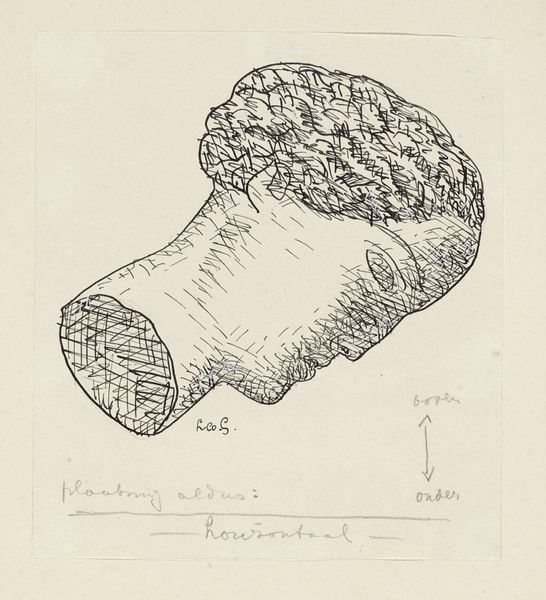 Curator: Fernand Léger's 1933 drawing, "Fragment of a Nut," presents an abstracted view of, well, a section of a nut. Editor: It’s intriguing; I see it immediately as an exercise in pure form. The intense cross-hatching and shading lend a tactile dimension, creating volume in this minimalist piece. It seems as much about the exploration of light and shadow as it is about depicting a nut. Curator: Absolutely, but we need to see it within Léger’s wider focus on the mechanization of modern life and the impact this had on society during the interwar period. His turn to natural forms in the '30s speaks to a need to connect with something primal and real in contrast to the overwhelming machine age. Editor: Perhaps. Still, I'm struck by the visual dialogue between the soft curves of the nut and the sharp, almost aggressive hatching. It creates a dynamic tension, doesn't it? One can't overlook how Léger's command of line builds depth and gives life to an ordinary object. Curator: And one should note that Léger’s objectification of everyday life aligns with wider social trends of the time, where artists explored ordinary objects to challenge the dominance of traditional academic themes. The politics of modernism. Editor: Well, politics aside, consider the visual language at play here: a deliberate reduction of complexity, a stark contrast between the subject matter and technique. In essence, a sophisticated balancing act. Curator: Precisely, and by showcasing an object, "low brow", so to speak, Léger makes us reconsider the hierarchy inherent in art and the gaze imposed by society. Editor: Regardless, "Fragment of a Nut" remains a stimulating intersection of material exploration and understated complexity. Curator: It’s definitely a testament to the power of art to invite social and political reevaluation through the most mundane of objects.