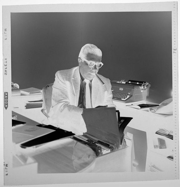 Curator: This silver gelatin print, "Untitled (man sitting at desk looking at papers)" by Jack Gould, presents an intriguing play of light and shadow. The inverted tones create a striking, almost ethereal effect. Editor: It evokes a sense of bureaucracy, doesn't it? The man at the desk, papers piled high... there’s a feeling of mid-century office life, perhaps even alienation, captured in the photographic negative. Curator: Absolutely. The composition draws the eye across the desk—the arrangement of objects is quite deliberate. The typewriter, for instance, offers a vanishing point, framing the figure and papers. Editor: I see it as a comment on the labor of documentation, the endless cycle of paperwork that defines so many lives. The stark contrasts amplify the feeling of isolation and anonymity. Curator: The use of negative space is also key. It provides a counterpoint to the density of the desk, creating a visual rhythm that is both dynamic and contemplative. Editor: Ultimately, this image captures the mood and social context of its time, reminding us of the often unseen labor that shapes our world. It's a powerful reminder of lives lived in the shadows. Curator: Indeed, the photograph stands as a testament to Gould’s adept command of photographic language.
