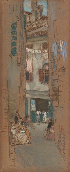 Curator: "The Open Door," painted in watercolor around 1901 by James Abbott McNeill Whistler. I find its humble domesticity immediately compelling. Editor: Compelling, yes, but initially its monochromatic palette—shades of ochre and muted blues—lend it an air of wistful melancholy. There’s a quiet austerity to the composition itself, softened by a light touch. Curator: Precisely! Whistler, known for his aestheticism, often explored themes of fleeting moments and understated beauty. Think about the broader cultural context: early 20th century, a time of rapid industrial change. This artwork may represent a nostalgic yearning for a simpler, pre-industrial past. Editor: An interesting point, but what strikes me most are the subtle nuances of tone and texture. Notice how the light delicately catches the doorway, creating a focal point? It’s a sophisticated play of light and shadow that defines the architecture, even in its simplest form. Curator: Indeed, Whistler wasn't merely capturing a scene but commenting on social hierarchies within the home, on the very nature of labour through its impact on gender and social visibility. Note the woman standing there, holding what appears to be cloth – is she waiting for work? It is her that holds your attention once you notice her in the scene, I argue. Editor: Maybe. But let’s also acknowledge how masterfully the watercolor technique renders the aged building; a tangible effect. There is careful intention in the execution—it goes beyond just narrative considerations. I also detect the influence of Impressionism. Curator: Art isn't created in a vacuum! The stylistic features inform its meaning, that is, the woman in a doorway at the time of day depicted, makes an entire comment on life as the artist perceived it for this group. Whistler has given voice to the invisible in society and that has to be valued and considered in any reading of his pieces. Editor: Well, through this analysis, I now see that I'm considering this artwork with fresh eyes. Curator: And perhaps gaining insight into the narratives art so vividly expresses.