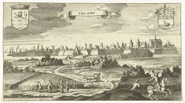 Curator: Here we have Gaspar Bouttats's "Gezicht op Lingen," a cityscape created in 1679, rendered as an etching, engraving and print. What's your first impression? Editor: Stark. Linear. There’s a clarity to the rendering, yet the overall mood feels...imposing, almost fortified. It's mostly black and white, emphasizing contrast. Curator: The technique enhances that effect, certainly. The sharp lines define the townscape. Consider the composition: the city is placed squarely in the center, bisecting the earth and sky. The artist really makes you feel its solidity, the design principles driving the whole image towards it. Editor: Indeed. And there's a fascinating tension between the city itself, clearly structured and deliberate, and the surrounding landscape, which is softer, more textured. That contrast probably served a purpose in the image’s time. Lingen itself was, at this point, a contested place that shifted control frequently between different European powers. Curator: Precisely! See how the artist manipulates the line to distinguish those zones—the meticulous precision around the buildings against the more atmospheric, almost hazy treatment of the sky. Note the texture; the sun and clouds appear as graphic patterns, underscoring their spatial ambiguity. Editor: It's all about visual representation and also cultural message. This rendering almost seems designed to emphasize its strength. The high vantage point adds to that sense of control, a panoptic vision meant to impress viewers with the might, despite Lingen's size. You also notice people within, and those journeying to Lingen seem to show its importance, Curator: Yes. And that textual banner above adds another layer. "De Stadt Lingen." An unequivocal statement of identity, or, even pride in place within a print about the space. It declares what the eye clearly confirms! The formal properties underline a specific idea of this locale and identity. Editor: It shows us just how potent cityscapes like this could be in asserting place and power. Food for thought on urban identity, past and present. Curator: Precisely, this is indeed a captivating image and really reveals the artist's understanding of their medium and time.