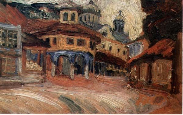 Curator: Let's turn our attention to "Târgu Cucului Inn," an oil painting by Stefan Dimitrescu, dating back to 1930. Editor: Well, immediately I feel this slightly melancholic quiet. It's not depressing, just… hushed. And those tightly packed buildings under a somewhat ominous sky--it creates a fascinating tension. Curator: Interesting you say that, because I find it insightful to think of it in terms of post-World War I Romanian society. Dimitrescu, who trained in law before fully committing to painting, depicts a somewhat dilapidated, small town atmosphere using muted tones that perhaps evoke that period's uncertainty. Oil paints as the medium allowed him this texture that seems to weigh on the very scene depicted. Editor: Exactly! There's almost a weightiness in how he applied the paint – it's not light and airy, it feels deliberate and perhaps weary, in a sense capturing the emotional and material aftermath. Notice the textures? You can almost feel the age in those buildings. I think it’s less about celebrating architecture and more about documenting lives lived within those spaces. Curator: Precisely. His technique here really pushes beyond strict realism. He blends it with elements of modernism, creating a space that feels familiar yet distanced, perhaps even highlighting social disparities visible even in the materiality of the Inn, advertised boldly on the wall. What's produced and what's consumed within its walls is an interesting contemplation, wouldn't you say? Editor: Absolutely. Consumption as refuge, or even a silent scream. Art often obscures things while revealing them, and that sign suggesting escapism against a background that reeks of reality...it makes one ponder the human spirit during these transformative eras. Curator: The artist also used perspective not traditionally viewed as "correct", leading us to an intuitive representation. This artwork encapsulates for me how much social observation could come through visual mediums at that time. Editor: I think I walk away from this with more questions than answers about post-war consciousness; not bad for just a little cityscape of an inn. Curator: Indeed, sometimes a glimpse of an ordinary building offers a perspective into profound times.