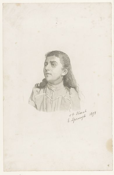 Curator: Here we have a drawing titled "Portret van een onbekende jonge vrouw, mogelijk de zus van Emile Spruyt," or "Portrait of an unknown young woman, possibly the sister of Emile Spruyt," created in 1894 by Emile Pierre Maria Spruyt. Editor: Isn't she lovely? She has a delicate, dreamlike quality that just pulls you in. The portrait feels so intimate, almost like stumbling upon a private moment. Curator: The piece invites us to consider the limited agency women often had within 19th-century portraiture. Do we view this work merely as a physical likeness, or can it represent her silent experience? It appears the subject, potentially Spruyt’s sister, embodies this restricted gaze. Editor: Absolutely. I feel her vulnerability, sure, but there's also an unmistakable glimmer of determination in her eyes. A flicker, perhaps, of inner rebellion? It feels incredibly modern, doesn’t it? Curator: Indeed. Looking at this piece now through the lens of intersectional feminism, one is keen to wonder about class and societal expectations of women. Spruyt created this during a pivotal period, when the first wave of feminism gained traction in Belgium. Editor: The subtle shading, the way the light catches her hair...it all contributes to a narrative beyond just a face on paper. It's more than just technique; it's an atmosphere he's crafted. A quiet but powerful mood. It also strikes me: I want to know her secrets. Curator: Agreed. Spruyt, in his careful detailing, does humanize his subject beyond the male gaze, granting her a kind of interiority seldom seen at the time. While rooted in tradition, the portrait hints at an emergent modern consciousness, one in which female subjectivity begins to claim space within the visual arts. Editor: It makes you think about all the unrecorded histories, doesn't it? All the quiet acts of resistance in those long ago drawing rooms. This seemingly simple sketch is more revolutionary than it first appears. Curator: Yes, the quiet resistance echoes across the years, underscoring art's powerful ability to encapsulate historical tension and transformation, providing nuanced perspectives on female identity beyond societal norms. Editor: Thanks. This gives a person something solid to chew on. I leave this spot richer.
