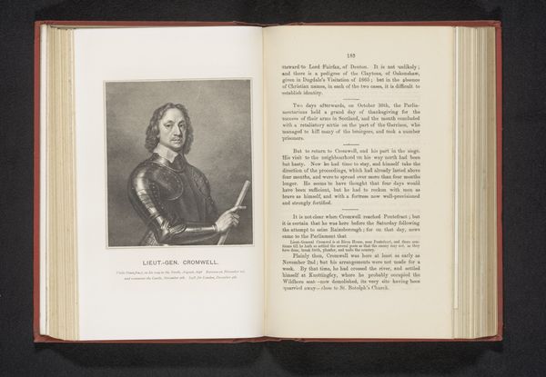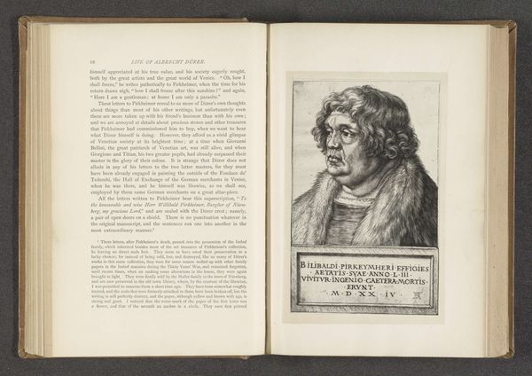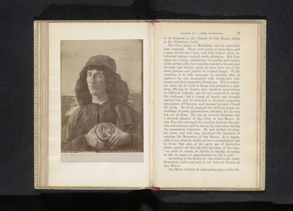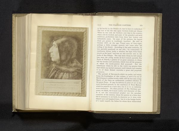 Curator: Looking at this open book, we see on the right-hand page a print entitled "Fotoreproductie van een schilderij, voorstellende een portret van Girolamo Savonarola," made before 1863 by an anonymous artist. It resides here at the Rijksmuseum. What's your first impression? Editor: Bleak! Intensely bleak, in a way that makes me want to offer him a nice cup of herbal tea and a shoulder to cry on. He looks...haunted, doesn't he? It’s like he knows something terrible is about to happen. Curator: Indeed. The stark lines of the print, created using a photographic reproduction technique, certainly emphasize a somber mood. We see a profile of Savonarola, a 15th-century Dominican friar known for his fiery sermons and clashes with the papacy. Notice the details—the strong, aquiline nose, the pursed lips, the heavy cowl casting shadows. These aren't just features, they communicate a man of intense conviction. Editor: It's the severity of the silhouette, I think. The way the darkness kind of eats into his face… there's very little light or joy here. This image isn’t about flattering the subject. The printer clearly prioritised conveying the weight of Savonarola’s persona. Did he want viewers to think about him critically? Curator: Precisely. It serves less as a celebration and more as a character study, an almost forensic analysis. The very medium, print, makes it accessible. Disseminating his image allowed for his story, his moral stance to become more known to society. Editor: That text at the bottom, it gives off historical vibes. Did Savonarola see himself as divinely inspired? That lettering almost casts him as biblical... Curator: It suggests a perception of him as more than just a political figure. Savonarola walked a tightrope of both religious piety and severe political views. Editor: You almost forget that this work lives inside a book, that makes the image both precious and like a fleeting ghost in a greater narrative. A poignant contrast. Curator: The print successfully immortalizes Savonarola. A striking reflection, achieved through careful interplay of shadow, line, and historical resonance. Editor: Yeah, thinking about how much drama one face can contain really adds some weight. An incredible peek into one moment in history!