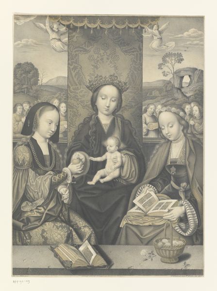 Carl Heindel created this print, titled ‘Holy Family,’ in the 19th century. It’s a period when traditional religious images circulated widely, yet also a time of questioning established norms. Here, Mary, Joseph, and baby Jesus are rendered through a decidedly European lens, which has implications for how we understand identity. The image is idealized, perhaps to represent a particular kind of purity and divinity. As you observe the subjects, consider who is included and who is not. Whose stories are deemed worthy of representation? Mary's gentle gaze and submissive posture uphold conventional notions of feminine virtue, which in turn reinforces specific power dynamics. The cherubic angel hovering above, offers an emotional counterpoint. It asks viewers to contemplate the tensions between religious devotion, artistic interpretation, and social constructs. How does the artwork shape our understanding of holiness, family, and identity?
