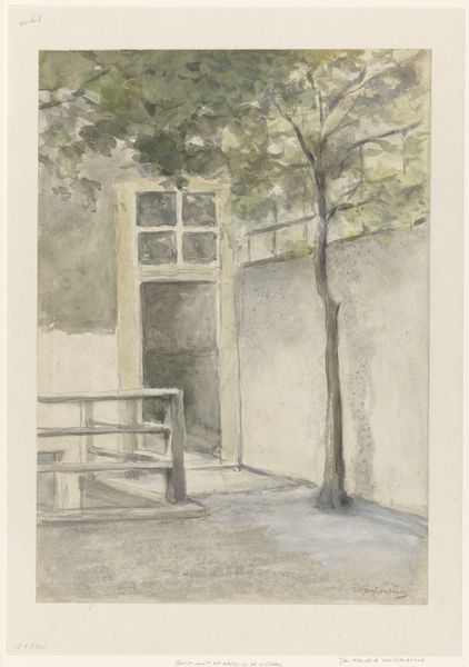 Editor: Here we have Johan Hendrik Weissenbruch's watercolor from between 1834 and 1903, titled "View of a Courtyard from the Artist's Studio on Kazernestraat in The Hague." It's quite understated, almost melancholic, in its depiction of everyday life. What strikes you about it? Curator: The watercolor medium is crucial here. Its inherent transparency and fluidity allow Weissenbruch to capture the transient quality of light and atmosphere. The rapid execution afforded by watercolor also suggests a certain immediacy, a capturing of a fleeting moment. How does this immediacy speak to the emerging industrial era, do you think? Editor: I hadn't considered the speed of execution in relation to industrialization, that's insightful! The sketch-like quality, then, could be seen as a counterpoint to mass-produced goods? Curator: Precisely. The deliberate choice of a humble, everyday scene, rendered in such a direct, almost utilitarian medium, can be viewed as a comment on the values of craft and individual experience against the rising tide of industrial standardization. Look at how the roughness of the brushstrokes and the visible paper grain challenge the idea of perfect representation. Editor: So it’s not just a picture of a courtyard, but also a subtle statement about the artist’s labor and values in a changing society? Curator: Absolutely. The very act of *making*, the materials used, and the conscious decisions about technique all point to a deeper engagement with the social and economic realities of the time. Consider the ready availability of watercolor versus the intensive labour needed for, say, oil painting; there’s an egalitarianism there. Editor: I’m beginning to see it differently now. I initially focused on the quiet mood, but the materiality and the production itself tells a story about art’s role in that era. Curator: Exactly. By focusing on the "how" and "what" of its making, rather than just the "what" it depicts, we unlock a far richer understanding.