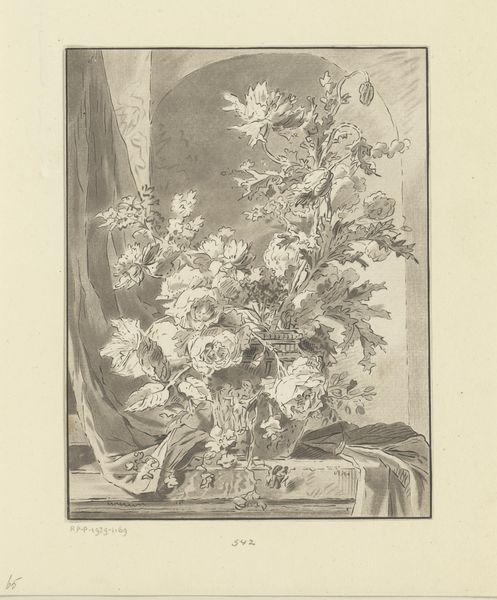 Editor: We are looking at "Stilleven met bloemen," a print made with the etching technique by Louis Marie Lemaire around 1880. There is an antiquated, peaceful stillness to the whole piece, it's kind of fascinating. What do you see in this piece, especially from a historical standpoint? Curator: This print embodies the late 19th-century art market’s complicated relationship with Impressionism. Its monochrome execution signals an accessibility, intended for middle-class consumption through print culture, making 'high art' accessible. Have you considered that prints democratized art? Editor: I hadn’t considered that angle before. So, the choice of etching wasn’t purely aesthetic but a conscious decision to broaden its appeal and audience? Curator: Exactly. The “originality” of art became a contested term, especially since new markets and exhibition strategies, like department store displays and smaller gallery spaces, embraced prints and photography to broaden the availability and recognition of art beyond the elite circles. Also, consider that the ‘intimacy’ of the still life genre allowed everyday citizens to enjoy something beautiful. Do you find it to be simply ‘decorative?’ Editor: I do get that ‘decorative’ vibe a bit but, recognizing its wider cultural distribution…it feels far less simple. The ability to be reproduced definitely reframes the power of artwork. Curator: Precisely! This piece, then, isn't just about pretty flowers; it's a cultural artifact that sheds light on how art was consumed and perceived. What seemed “simple” can expose how we all participate in the distribution of value. Editor: I now look at "Stilleven met bloemen" with an entirely new lens. Thanks! Curator: A lens focusing on both art and its audience!
