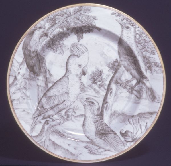 Curator: The reddish-brown hue gives this piece an immediate antiquated feel. Editor: That's fitting, considering what it depicts. This is "Architectural Fantasy" by Jean Laurent Legeay, created sometime between 1780 and 1795. It’s a print made from etching and drawing. Curator: Indeed, a seemingly Neoclassical composition rendered with a distinctly picturesque quality, mediated through its round format. Editor: Right, that tondo shape, typical of decorative prints at the time, softens the monumental feel. Observe how the artist incorporates broken columns and crumbling structures, elements which were often included in Grand Tour souvenirs for European elites. It is more about feeling and ruin than precision, wouldn't you agree? Curator: I concur that the ruin evokes an elegiac tone. The scale, the contrast between the elaborate foreground and the softer background – it invites contemplation, a reflection on time. Editor: Absolutely, note that hanging lamp. It's a symbol of human presence amidst all of this. But tell me, what do you make of its structure, Curator? How does the symmetry and placement work within the frame? Curator: There's a definite layering – a foreground framing the background's central void. Note the interplay of textures – the smoothness of the sky versus the defined line work creating textures, and that symmetry does create a sort of stabilizing structure. Editor: Legeay's fantasy presents a civilization in decline but suggests endurance in their visual memory and architecture, no? The Grand Tour allowed elites to feel attached to this past. Curator: Indeed, the crumbling architecture tells a clear narrative of shifting empires and changing values. The viewer is left to grapple with this loss. Editor: A grand piece for rumination and an interesting glimpse at how civilizations preserve—and sometimes elegize—the past through their art. Curator: A pertinent meditation on decay and enduring architectural presence. A thoughtful dialogue between medium and content indeed.