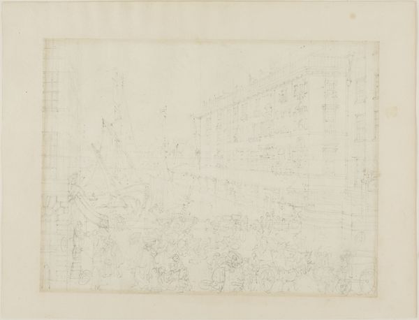 Editor: So, this is "Study for The Coal Exchange, from Microcosm of London," dating from around 1808 by Augustus Charles Pugin. It's a print, etching and graphite on paper, and it depicts quite a busy scene. It seems almost like a blueprint, very light and delicate. What catches your eye about this study? Curator: Immediately, I’m drawn to the way Pugin captures a burgeoning London at a pivotal moment. The Coal Exchange itself was a locus of economic activity and social interaction, representing the engine of British industrial power. Think about the "Microcosm of London" series itself, a project aiming to depict the various aspects of London life. How does Pugin present the exchange as a social space? Editor: Well, despite the delicate lines, there are definitely a lot of people represented, and it seems to be more about the architecture and the people, not necessarily about the coal being traded. They’re sort of blending into the architectural space, right? Curator: Exactly. It reflects a specific ideology where civic structures are as important as its citizens, underscoring the significance of commerce and community in shaping the city's identity. The Coal Exchange isn't just a marketplace; it's a symbol of London's status. Does this give you any insight into how the representation of spaces can impact public perceptions? Editor: That's fascinating. I see how it glorifies the civic structure. I guess I hadn't thought about how the selection of subjects like this one and its representation could serve a political purpose, or bolster certain ideas about society. It also makes me wonder about who these images were meant for – and what purpose they ultimately served! Curator: Precisely! Understanding the context in which art is produced, displayed, and consumed can significantly reshape our understanding. Editor: That’s given me a lot to think about. I really appreciate you helping me see past the surface!