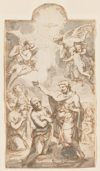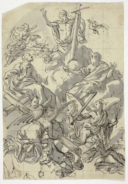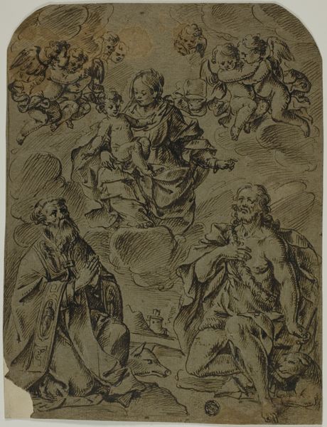 Curator: Here we have a drawing attributed to Francesco di Maria, created sometime between 1623 and 1690. It’s a pen and ink sketch, double-sided, with a religious scene on one side and a mythological scene on the other. Editor: My immediate impression is of movement. The ink washes create a real sense of fluidity, particularly around the Virgin and Child. Curator: Exactly! Di Maria really captures the dynamism characteristic of the Baroque period. The recto side presents a fairly conventional grouping—a Madonna and Child adored by saints, perhaps Joseph of Arimathea and Saint Catherine of Siena—hovering amidst cherubic figures. Editor: It’s the verso that grabs my attention, frankly. A warrior alongside Minerva Bellona suggests something about the socio-political currents. Was this meant to perhaps depict a call for justice, power, or maybe it shows the role that classic allegories continued to play at the time, even when reinterpreted during the Baroque? Curator: Interesting. Notice, though, how the composition is echoed across both sides. The grouping of figures remains the primary focus, even with the shift in subject matter. Consider the artist's control over line and tone; it speaks volumes about the evolution of drawing as a distinct art form. He very intentionally plays with tonal contrast. Editor: I can see your point. I guess I can’t help but bring it back to the institutions which ultimately shape how pieces like this survive. That the work landed at The Met is a testament to its perceived importance over time—it continues a dialogue and generates questions, obviously. What stories have these drawings told, and for whom? Curator: It’s in pieces like these that we trace formal evolution through nuanced transitions—from compositional structure to stylistic choices of the baroque era. Editor: A visual record, a moment captured—evidence of changing styles of devotion and maybe even the rise of European power—remarkably captured.